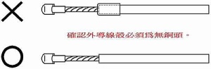 - 確認穿入端外導線殼,必須為無銅頭及外皮不可有剝皮現象。(有銅頭或剝皮會影響外導線殼穿入無法到底定位。)