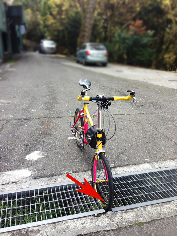 有個水溝蓋 孔隙這麼大…紅箭頭 ~行進方向…登山車輪宽大.. 也許 安全過関。