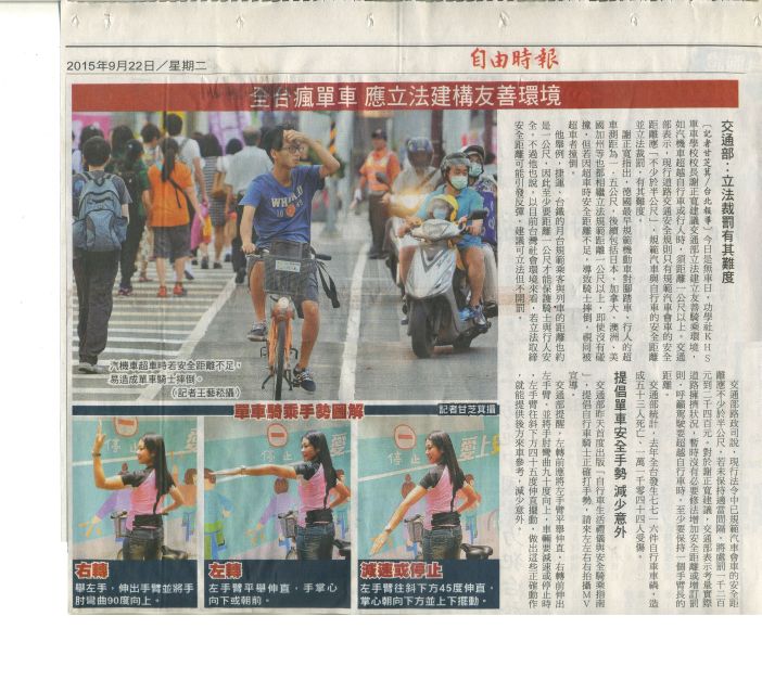 我們切望交通部能經營綠色交通的單車友善環境當中之一環:推動立法,機動車,超越行人或單車時,需有「橫向間隔空間」的1公尺,以保護行人(單車)之安全。(待續)