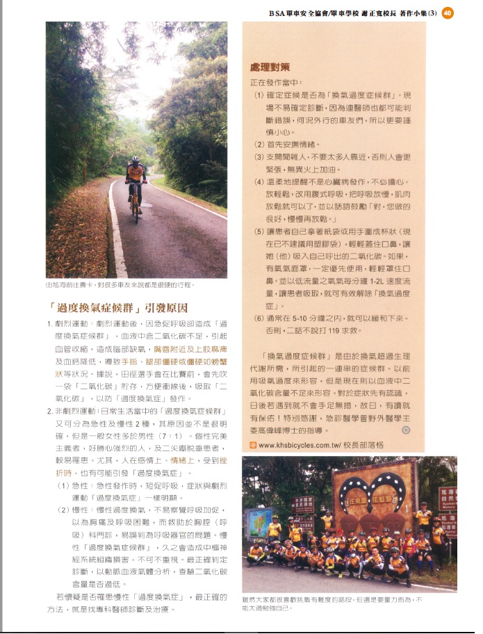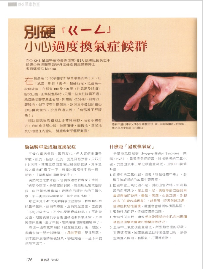 校長周末遊記 —– 快速解除:全身痙攣(過度換氣症候群) 星期一, 2016/07/25 久違的T20出動 途中校長救一位 主訴全身痙攣…..手指呈現螃蟹手, 過度換氣症車友 校長只用二招: 1. 用手軽摀鼻 多回吸Co2 不到五分鐘就解除 2. 肌肉放鬆 哈~偉大的校長 再謝關渡媽祖,共32公里花四個小時 再將之前撰述關於“過度換氣症候群”的文章跟大家分享
