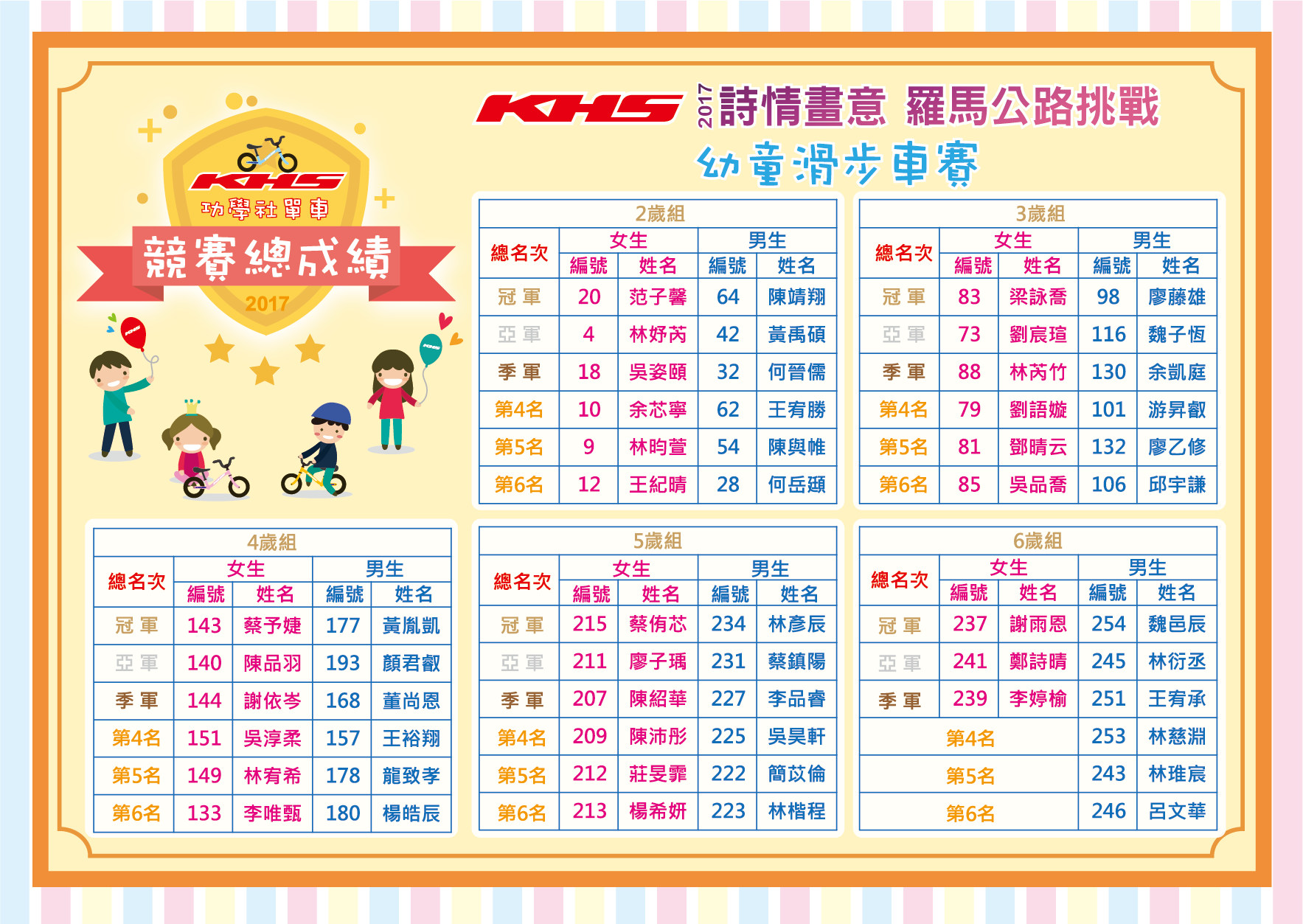 2. 滑步車依年齡分組,每分組取前六名1-3名頒發獎盃及獎狀第4~6名頒發獎牌及獎狀