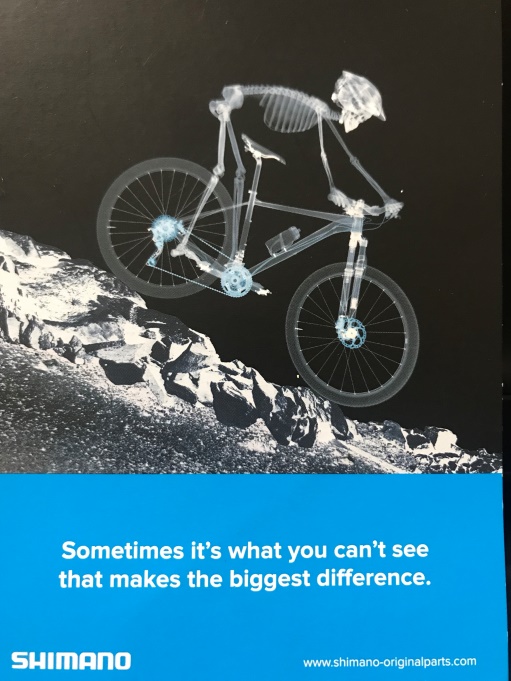 SHIMANO的下坡姿勢在石頭路,臀部甚至在座墊之後,重心在踏板之上,雙手才容易操控把手。否則,重心在把手之上,不但感覺很重,而且易犁田。
