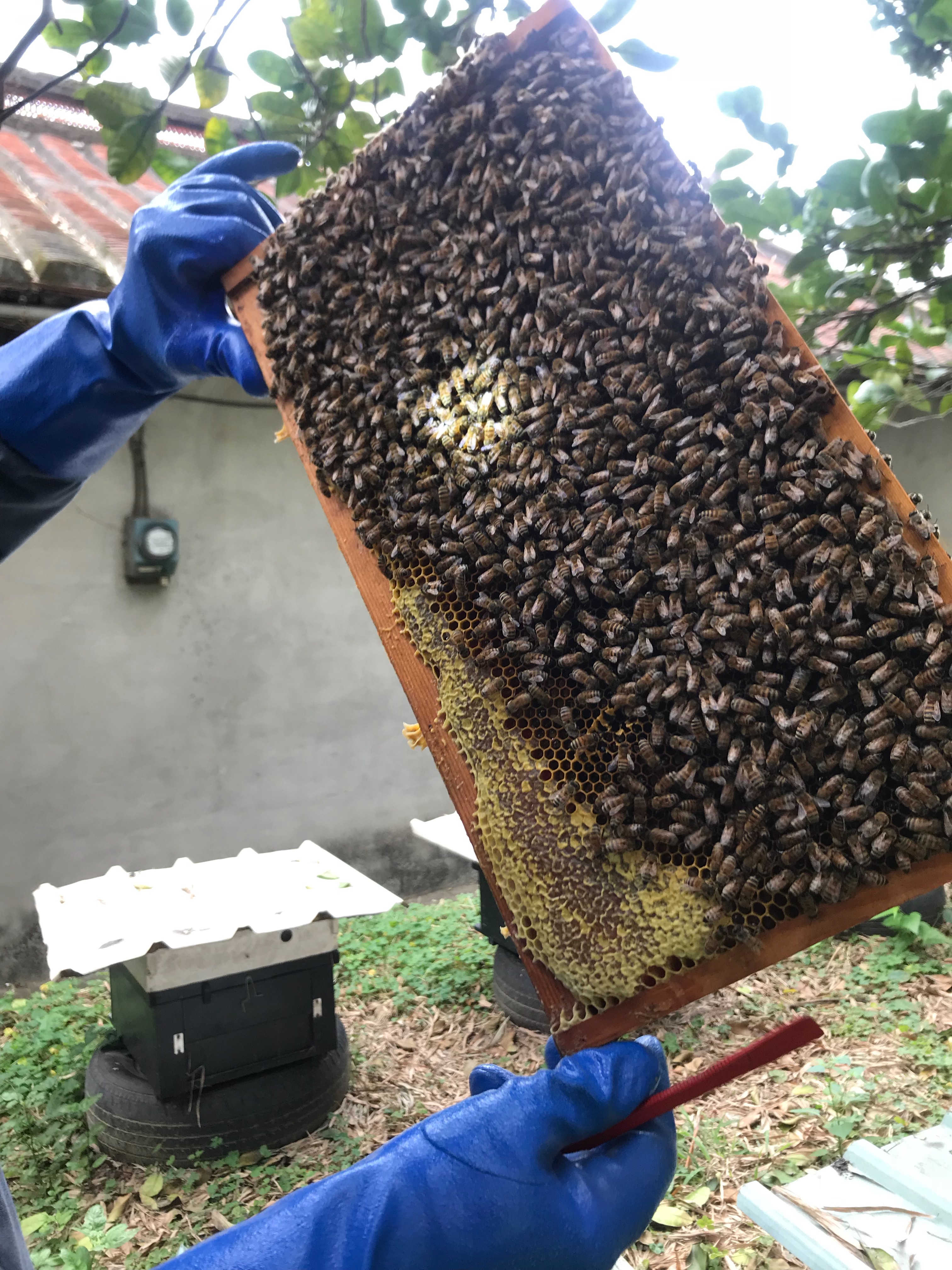 蜂種是溫和的義大利種,近距離者需載防蜂套。主人親切用頭燈照著手拿蜂巢教學,大開眼界。此為百花蜜(咸豊草花)。