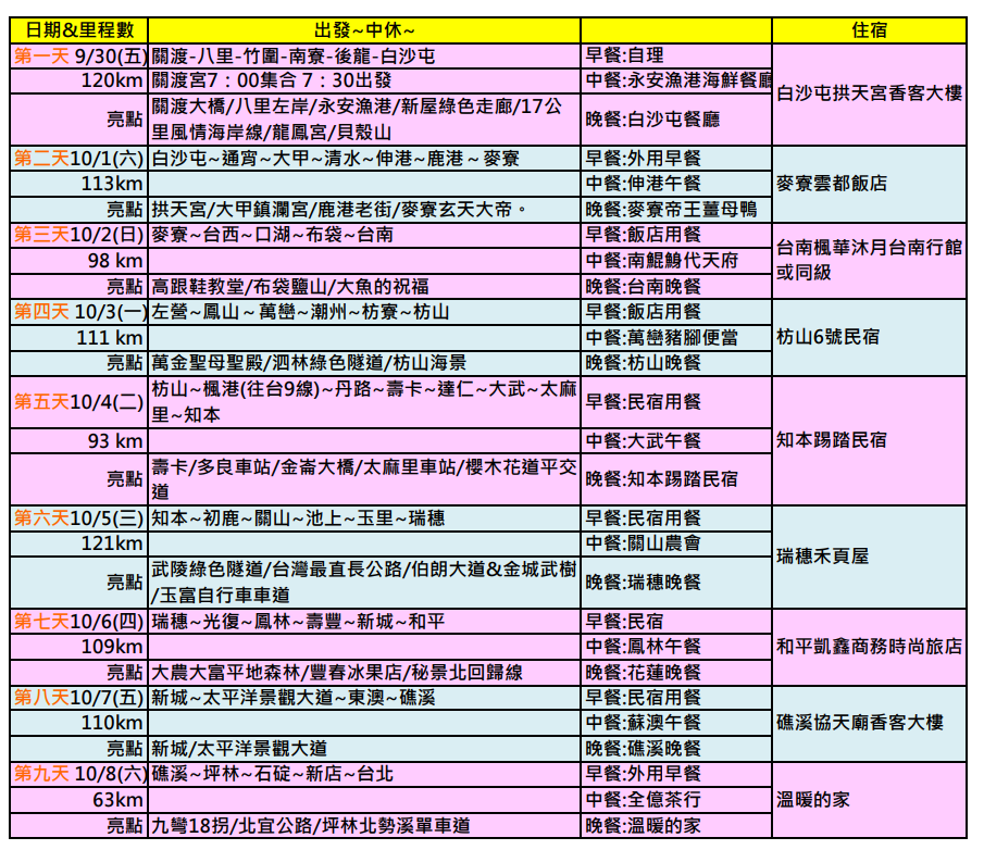12.環島為團體行動,安全至上,每日大小休息次數,行程會視當日天氣與團員的腳力而有所調整。