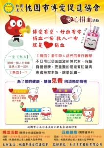 桃園市博愛促進協會的第三次公益捐血活動 時間:11月22(日)早上9點~下午5點半 地點:桃園區同德六街(藝文中心段) 捐血成功者有好禮相送 捐250cc贈品如下: 1.牛品牛排館餐券1張 2.台灣優質真空包裝白米一袋 3.博愛促進協會登山杖雨傘一支 4.台南關廟麵一大包 5.優活牌衛生紙10包裝一大串 6.香皂一盒 (以上贈品價值600元) 捐500cc者,除上述贈品 外加送桂格大燕麥片800g一大罐 贈品豐富 送完為止哦! ※配合捐血活動有各種單位所舉辦的免費檢測項目及各種教學如下 1.老人兒童社會福利及交通安全講習 2.CPR訓練宣傳教導 3.宣導政府長照政策 4.免費乳房攝影篩選 5. … 閱讀全文 / Read more →